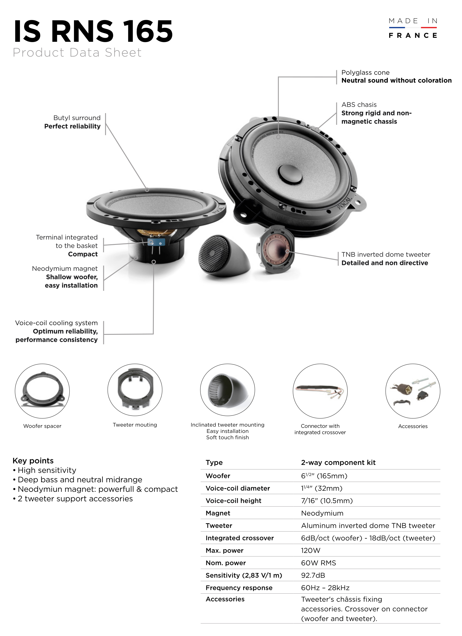 I driver degli altoparlanti integrano il cono in Polyglass per una gamma media definita e un motore al neodimio per consentire un profondità di installazione ridotta. I tweeter separati TNB, a cupola invertita in alluminio trattato, sfruttano la tecnologia Focal per rendere perfettamente gli acuti.