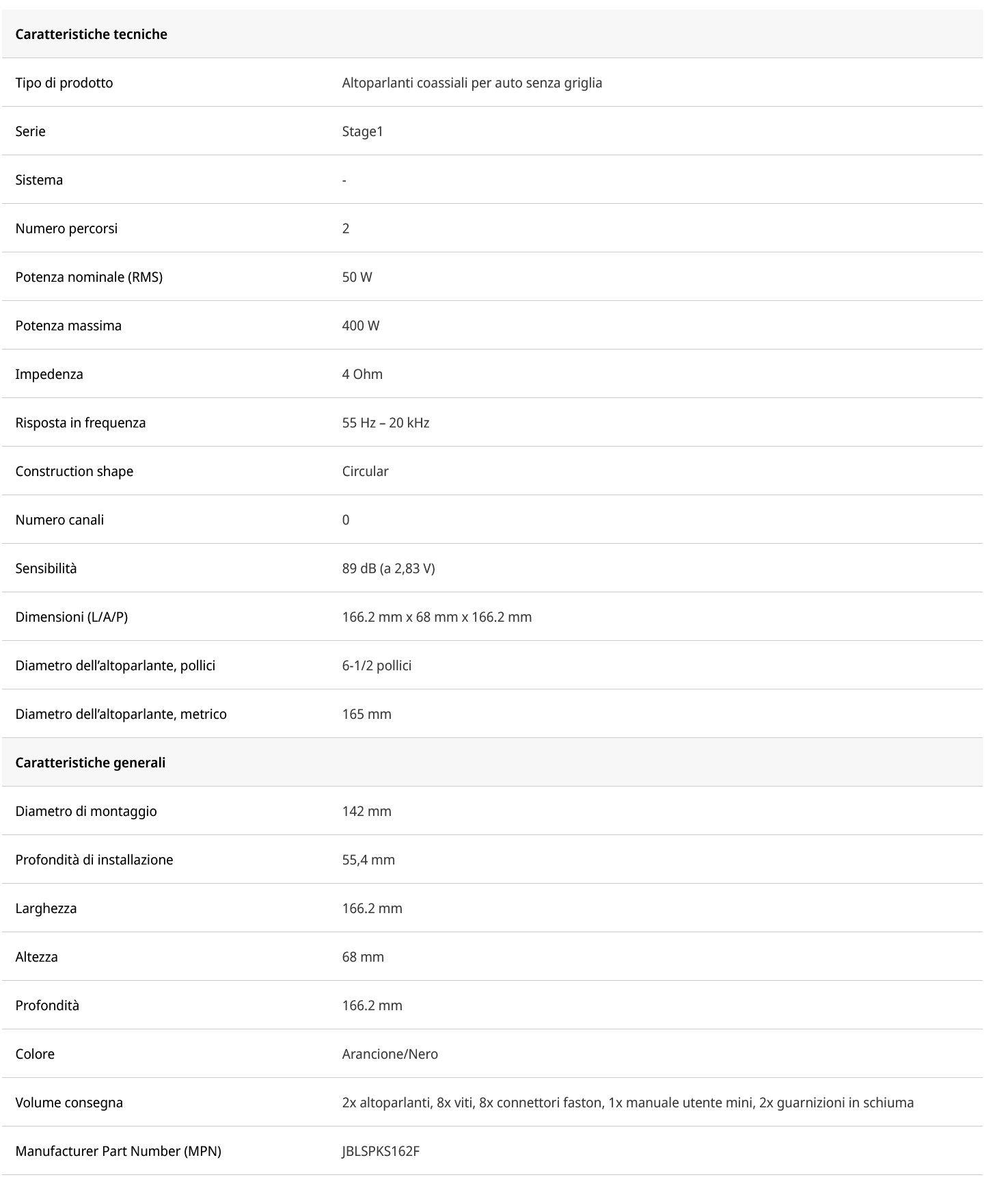 I JBL Stage1 62F sono la soluzione ideale per migliorare l’impianto audio di serie senza interventi complessi. Questo sistema coassiale a 2 vie unisce la tecnologia brevettata del woofer Plus One a un tweeter a cupola in PEI finemente calibrato, offrendo un suono chiaro, dinamico e bilanciato per l’ascolto quotidiano.