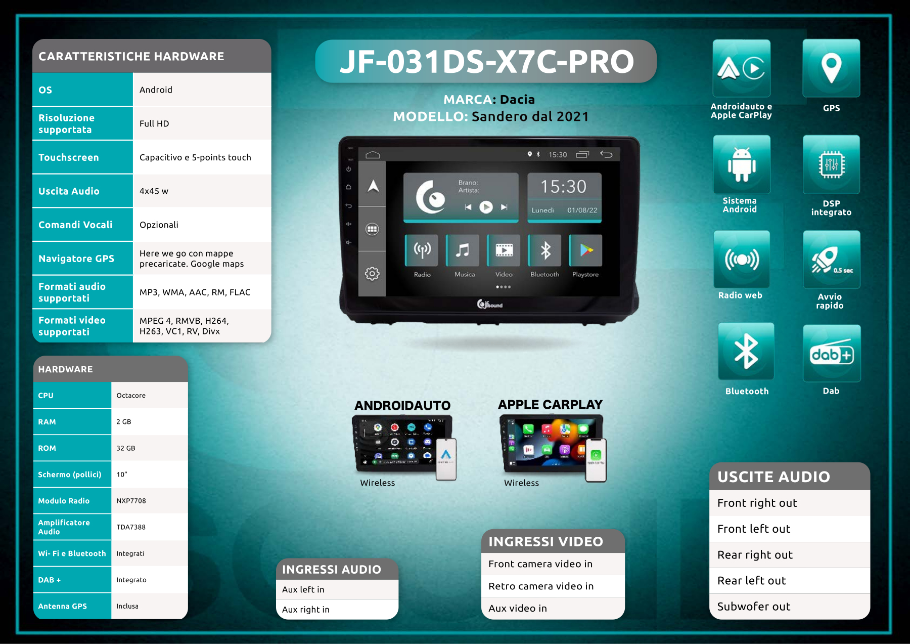 La versione X7C del sistema infotainment JFSound è equipaggiata con processore Octacore, RAM dedicata 2 GB, ROM da 32 GB, bluetooth, wi-fi e GPS integrati, potenza audio in uscita reale di 4 x 45 W.