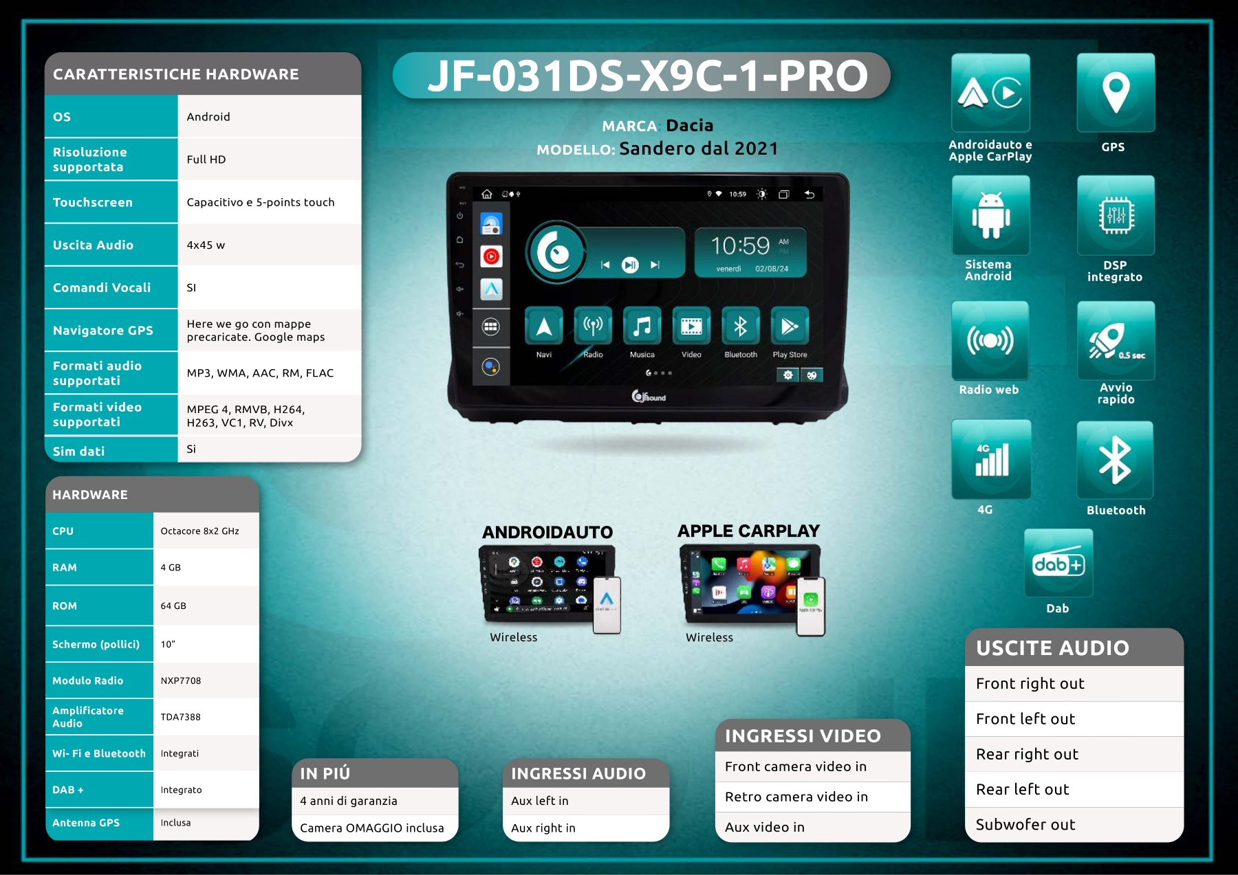La versione X9C del sistema infotainment JFSound è equipaggiata con processore Octacore, RAM dedicata 4 GB, ROM da 64 GB, bluetooth, wi-fi e GPS integrati, modulo radio migliorato con amplificatore e potenza audio in uscita reale di 4 x 45 W.