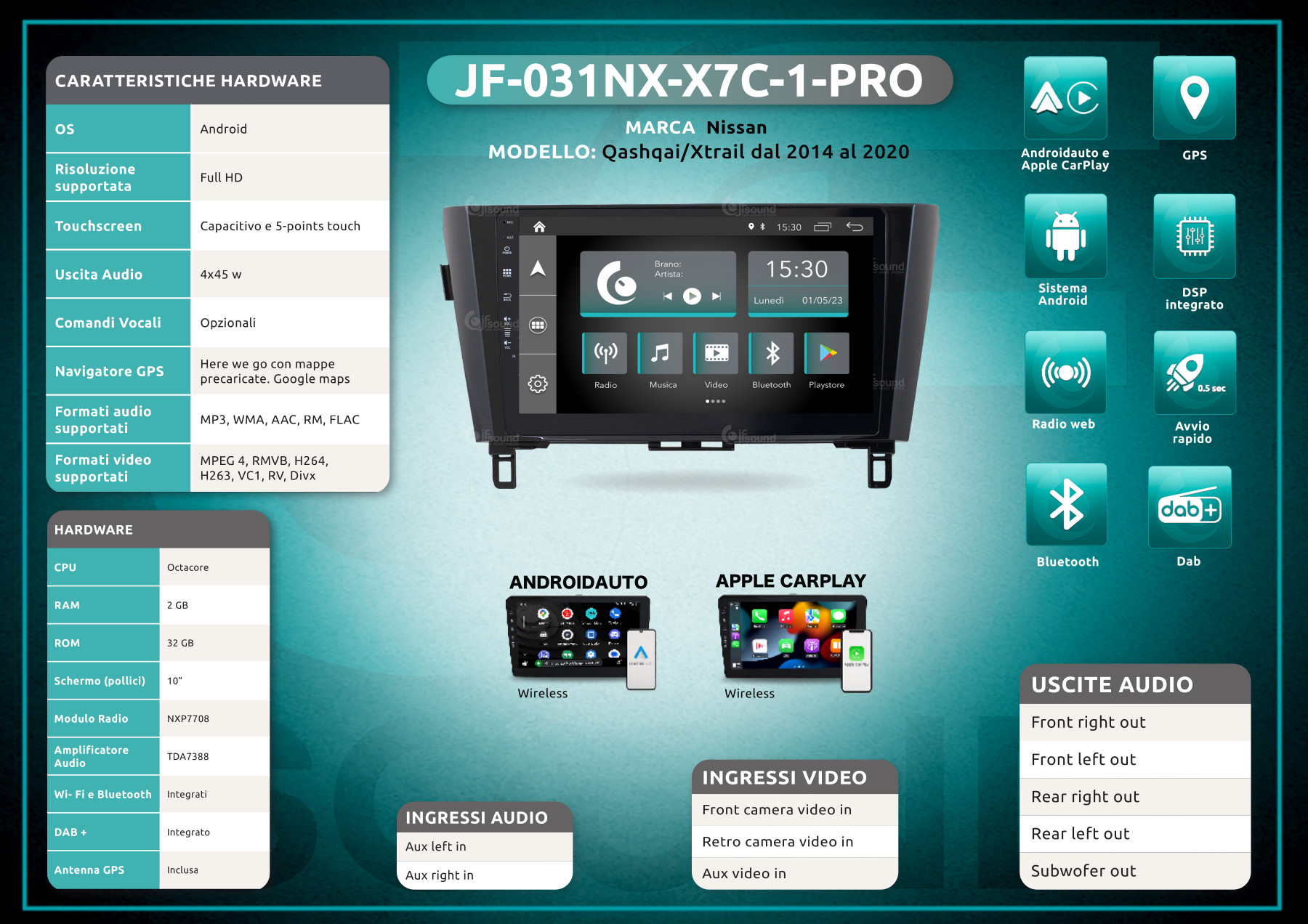 La versione X7C del sistema infotainment JFSound è equipaggiata con processore Octacore, RAM dedicata 2 GB, ROM da 32 GB, bluetooth, wi-fi e GPS integrati, potenza audio in uscita reale di 4 x 45 W.