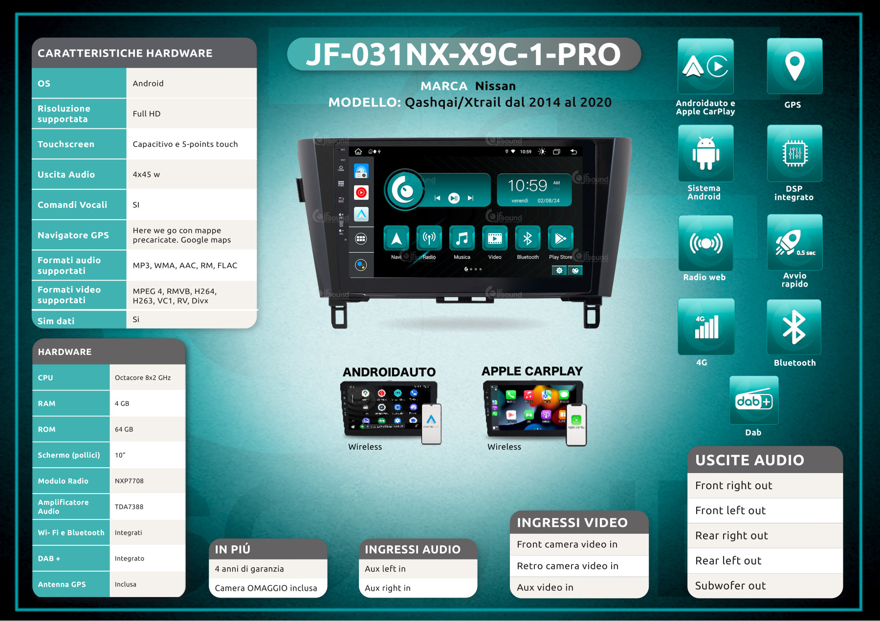 La versione X9C del sistema infotainment JFSound è equipaggiata con processore Octacore, RAM dedicata 4 GB, ROM da 64 GB, bluetooth, wi-fi e GPS integrati, modulo radio migliorato con amplificatore e potenza audio in uscita reale di 4 x 45 W.