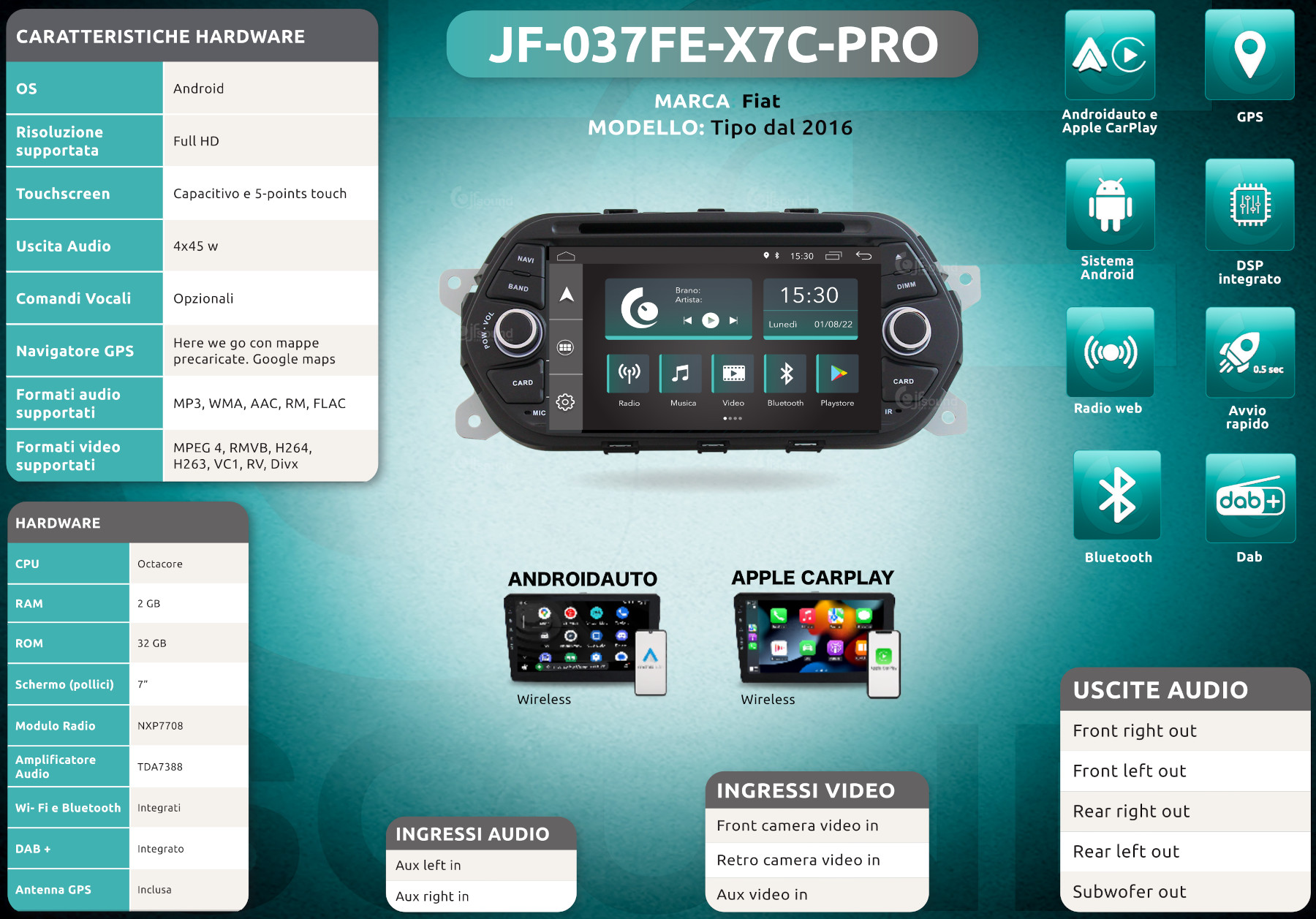 La versione X7C del sistema infotainment JFSound è equipaggiata con processore Octacore, RAM dedicata 2 GB, ROM da 32 GB, bluetooth, wi-fi e GPS integrati, potenza audio in uscita reale di 4 x 45 W.