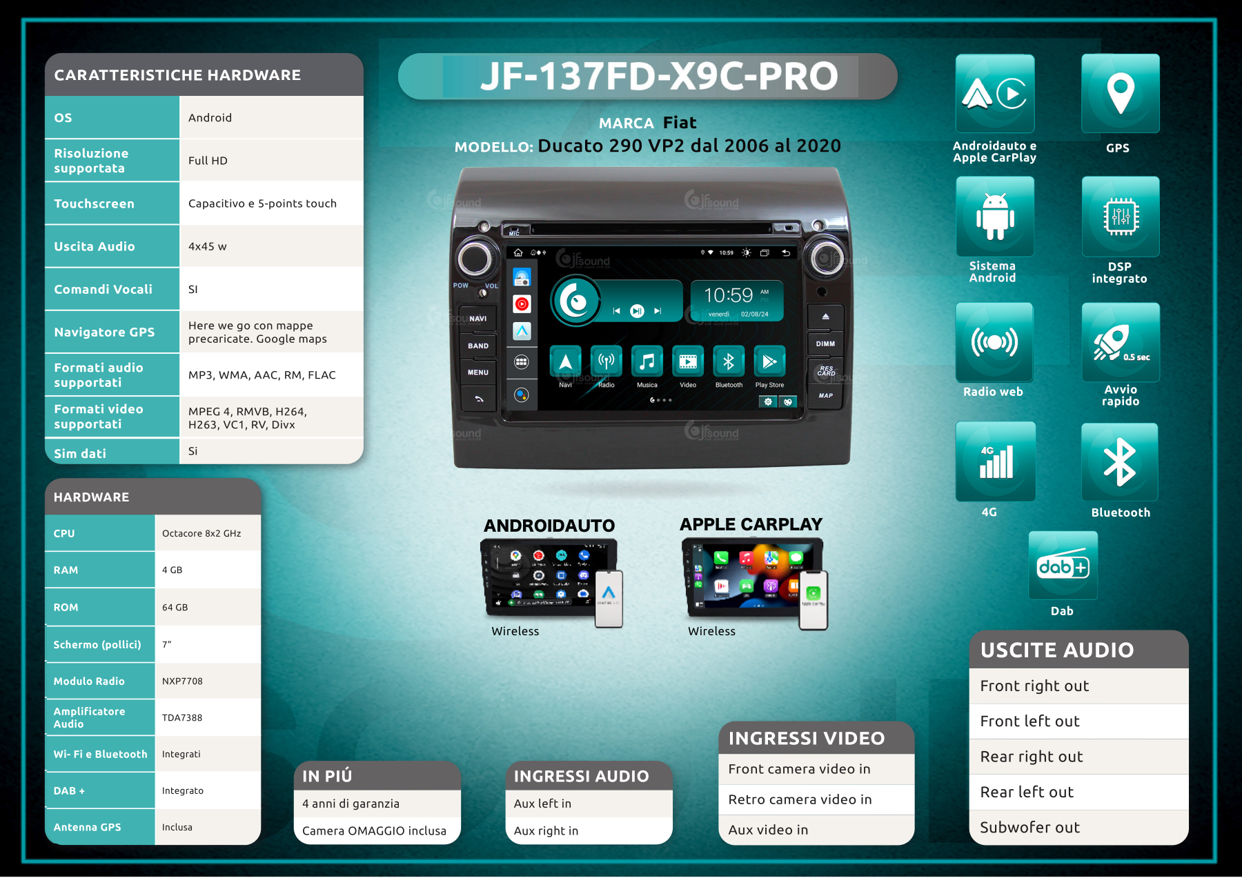 La versione X9C del sistema infotainment JFSound è equipaggiata con processore Octacore, RAM dedicata 4 GB, ROM da 64 GB, bluetooth, wi-fi e GPS integrati, modulo radio migliorato con amplificatore e potenza audio in uscita reale di 4 x 45 W.