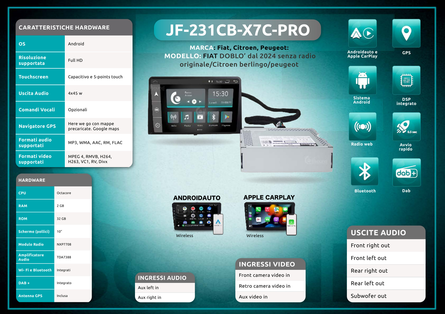 La versione X7C del sistema infotainment JFSound è equipaggiata con processore Octacore, RAM dedicata 2 GB, ROM da 32 GB, bluetooth, wi-fi e GPS integrati, potenza audio in uscita reale di 4 x 45 W.