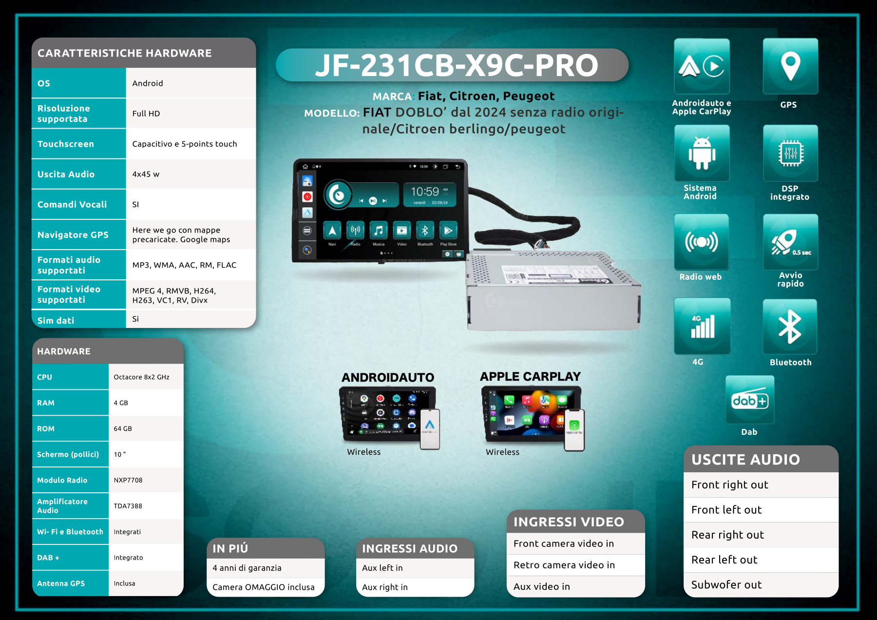 La versione X9C del sistema infotainment JFSound è equipaggiata con processore Octacore, RAM dedicata 4 GB, ROM da 64 GB, bluetooth, wi-fi e GPS integrati, modulo radio migliorato con amplificatore e potenza audio in uscita reale di 4 x 45 W.