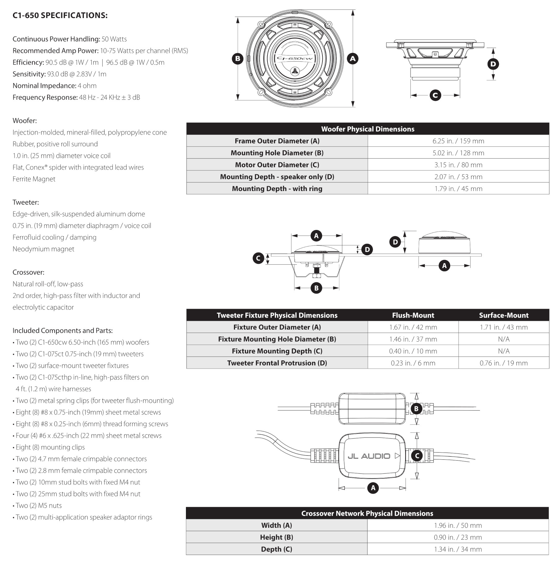 I driver dei woofer C1 beneficiano della modellazione FEA proprietaria e dell’esperienza di JL Audio nella progettazione di driver per le basse frequenze. Queste conoscenze vengono utilizzate per creare diffusori in grado di riprodurre suoni potenti, mantenendo al contempo un suono fluido, dinamico e a bassa distorsione. Il cuore del C1-650 è un telaio proprietario in acciaio stampato da 6,50 pollici (165 mm) e un sistema motore ottimizzato per DMA. Un cono in polipropilene stampato a iniezione con riempimento minerale è sospeso con una sospensione in gomma nella parte anteriore e uno spider piatto Conex® accuratamente progettato nella parte superiore della bobina mobile, per controllare con precisione il movimento della bobina mobile. I cavi sono accuratamente instradati e fissati agli spider per prevenire affaticamento e ronzio. Si tratta delle stesse caratteristiche e materiali normalmente presenti su altoparlanti molto più costosi.